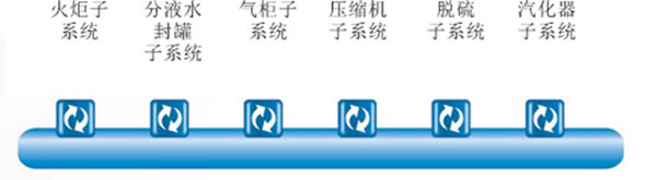 火炬系统六个子系统一体化。即火炬子系统、分液水封罐子系统、气柜子系统、压缩机子系统、脱硫子系统、汽化器子系统一体化。